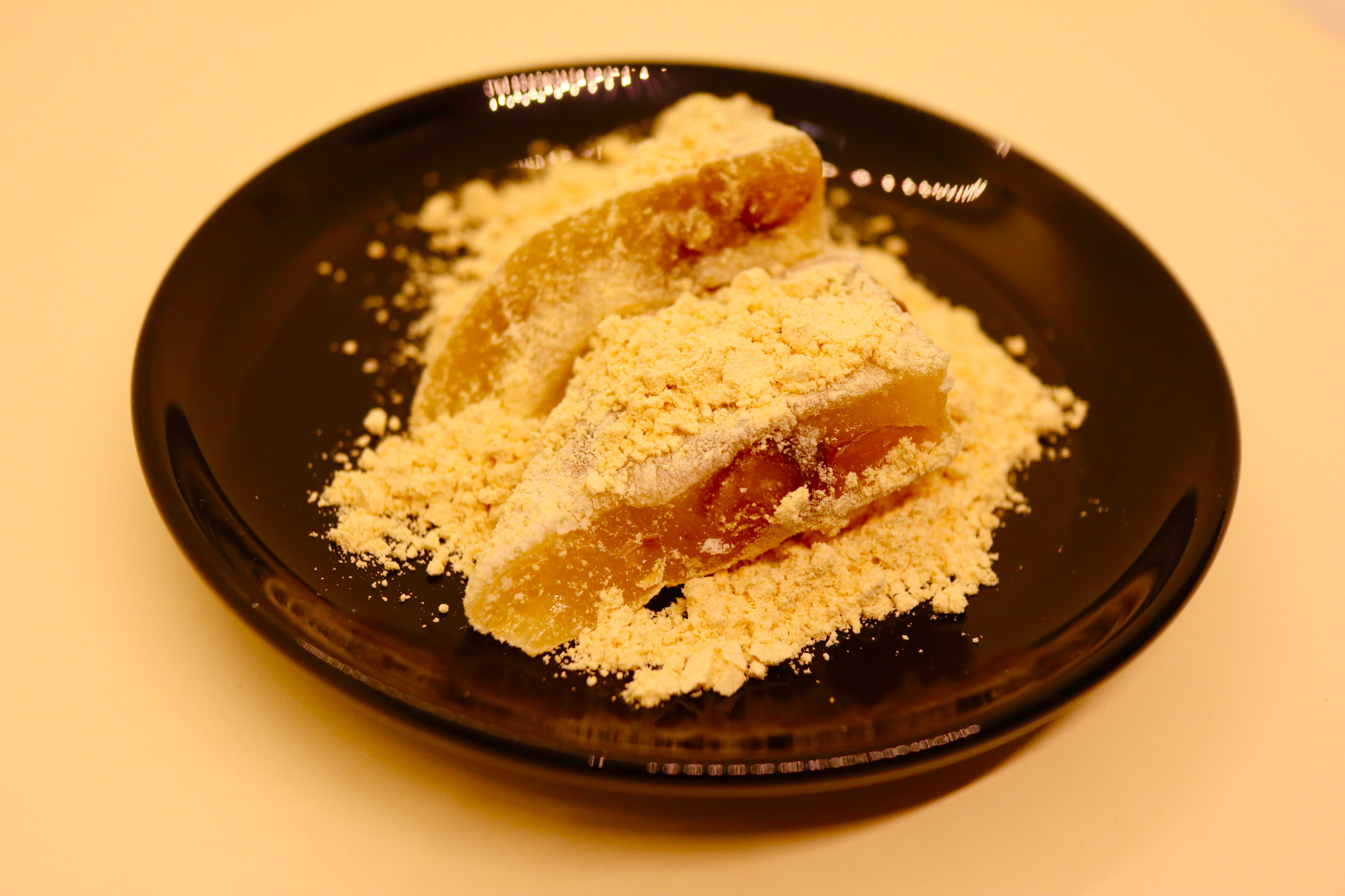3日間かけて煮含めた北海道産虎豆を、卵を練りこんだ求肥に練り込み、きな粉をまぶして仕上げております。