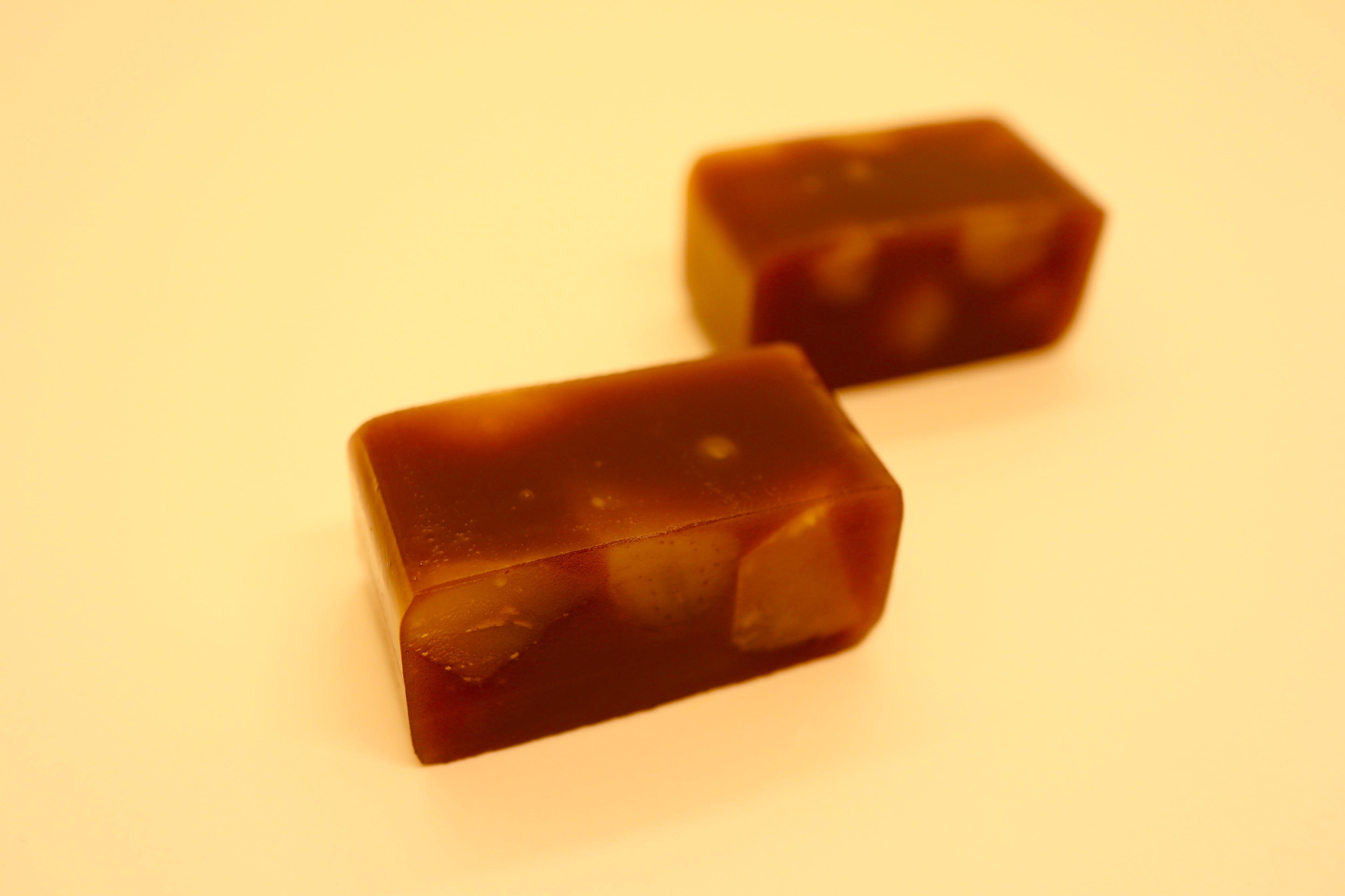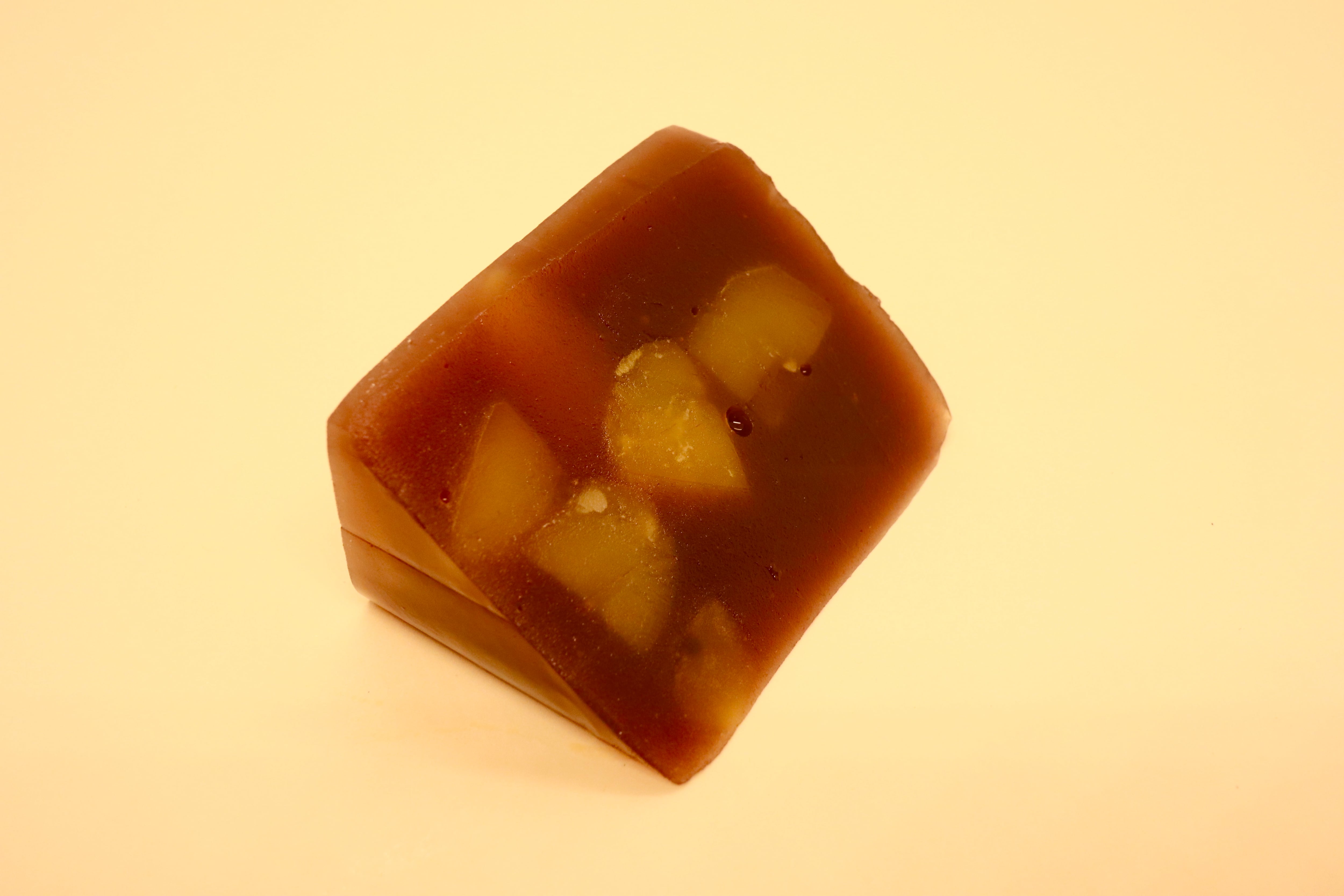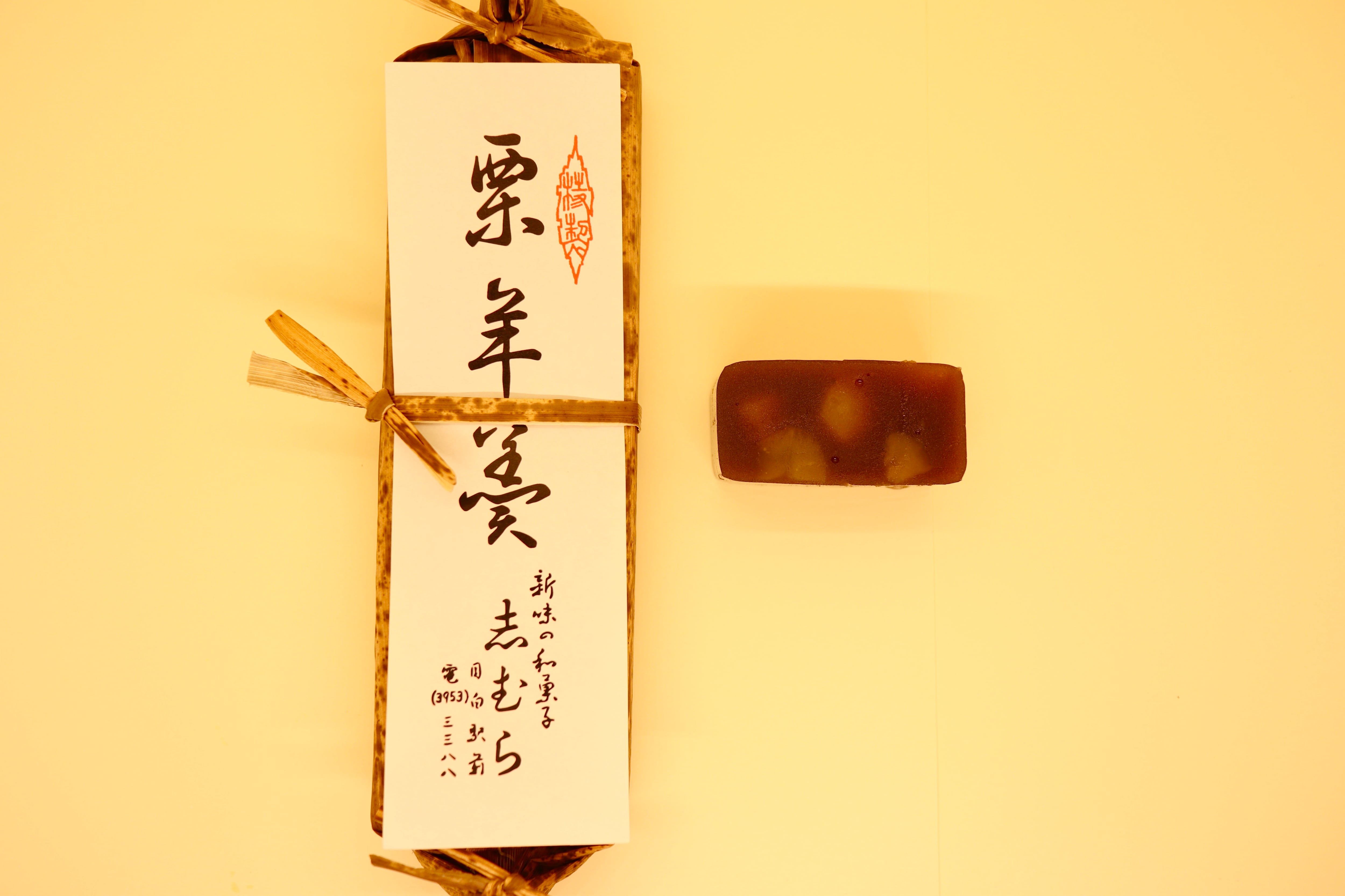 こし餡の本練り羊羹に、自家製の蜜付け栗をたっぷり含ませております。